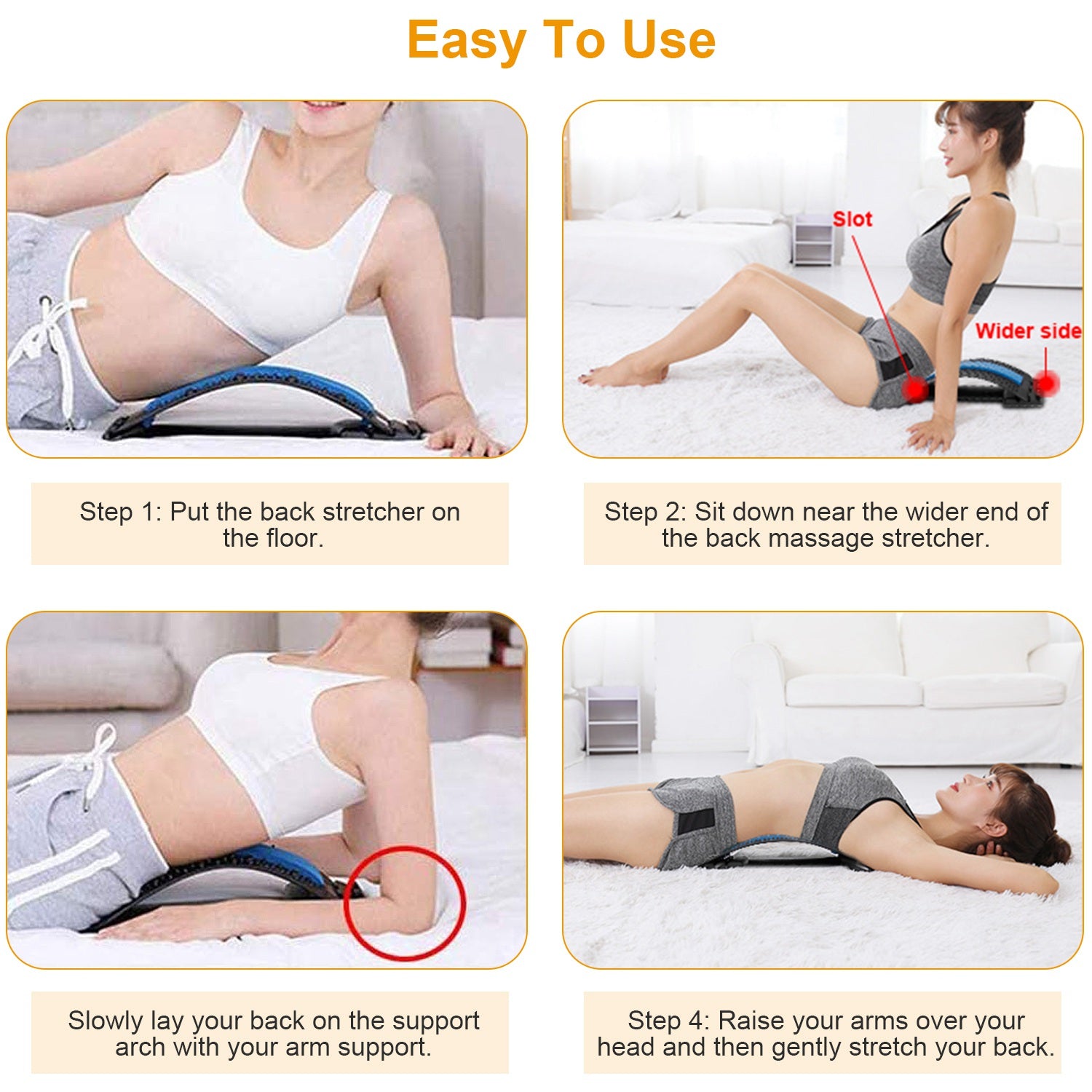 • **3 HEIGHTS ADJUSTABLE*: 2.76in/3.55in/4.34in These 3 adjustable settings,suit for initial user or sport lovers!You can fix this back stretcher device at the most comfortable level for easy stretching and effective pain relief. The higher the back stretcher,the more stretch you get.